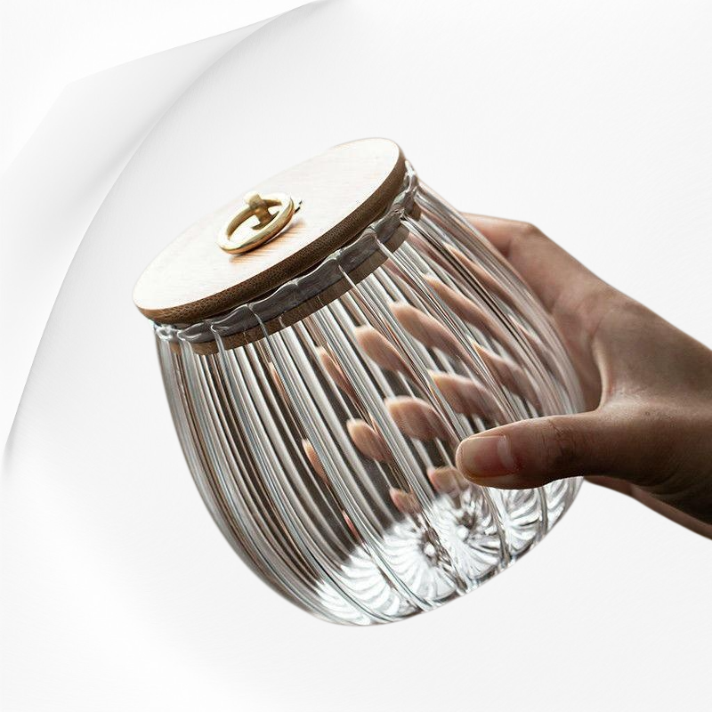 وعاء زجاجي مقاوم للحرارة مصنوع من البورسليكات العالي، تصميم شفاف مع خطوط عمودية، محكم الإغلاق، مناسب لتخزين الطعام وحفظ النكهات، سهل التنظيف وآمن للاستخدام اليومي.